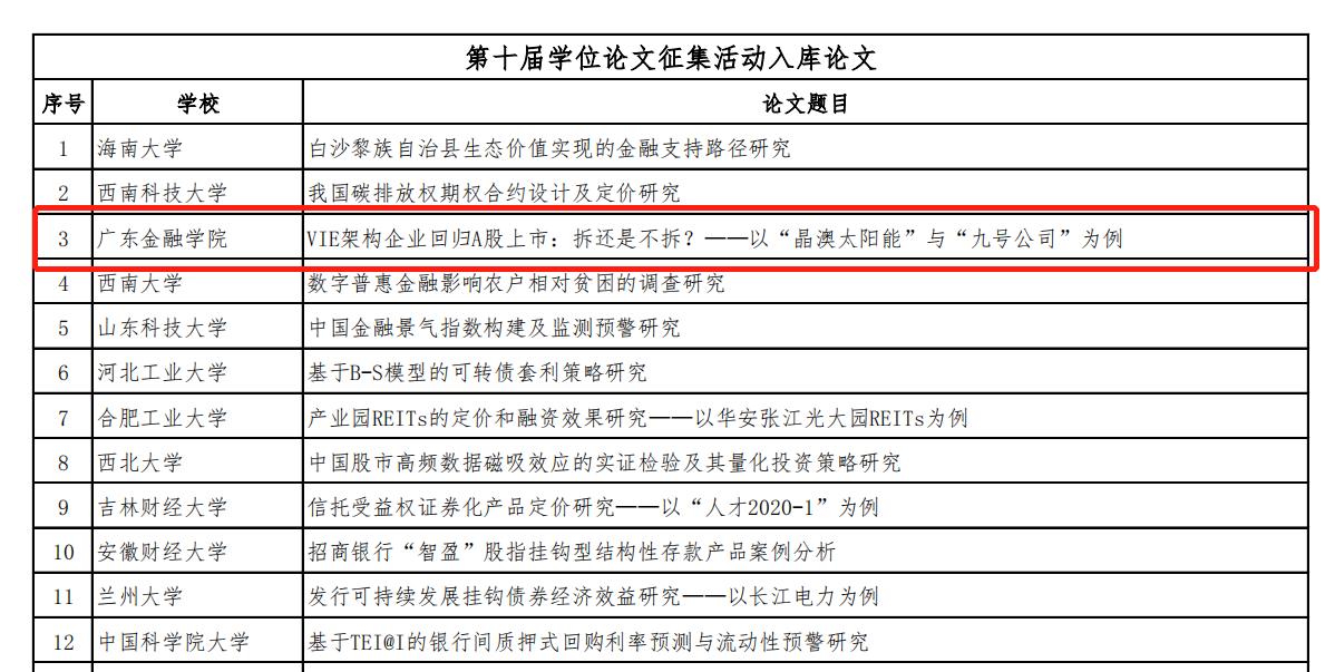 近日,全国金融专业学位研究生教育指导委员会公布了《关于中国金融专业学位论文中心第十届学位论文征集活动结果的通知》,bat365在线中国官网登录入口财务管理系主任陈见丽教授指导2021级金融硕士研究生余诗瑶完成的学位论文《VIE架构企业回归A股上市:拆还是不拆?——以“晶澳太阳能”与“九号公司”为例》入库中国金融专业学位论文中心。