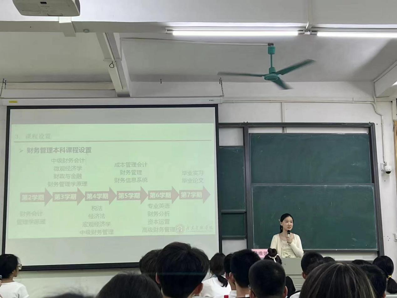 在财务管理专业见面会上,黄维娜博士为24级财务管理专业新生详细介绍了财务管理专业的内涵,包括专业知识体系、核心能力培养以及理论与实践的结合需求。黄博士还阐述了大学四年的课程规划,指导学生如何有效地学习课程,以及各阶段应如何为考取相关证书做准备。在就业市场人才需求方面,黄博士强调了创新能力、实操经验和跨领域知识的重要性。她建议学生们在学习过程中注重实践,在大一大二打下坚实的专业知识基础上,积极参与实习和项目,以提升自身的竞争力。此外,黄博士还现场解答了学生们关于学习和未来就业的相关疑问,帮助新生们更好地规划大学生涯和职业发展路径。讲座取得了良好的效果,同学们纷纷表示受益匪浅,对财务管理专业有了更深入的了解和认识。