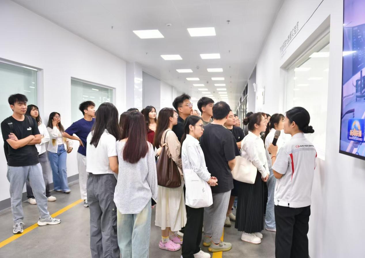 随后,调研队伍前往广汽研究院考察学习。同学们首先参观了企业展厅,通过视频资料深入理解了广汽研究院的发展历程、企业文化、产品矩阵以及未来发展战略。随后,在专业讲解员的引导下,同学们对智能网联汽车实验室和模拟设计实验室进行了实地考察。在智能网联汽车实验室,同学们目睹了广汽在自动驾驶、车联网、人工智能等前沿科技领域的研究成果,这些成果不仅展示了广汽的技术实力,也体现了其在智能网联领域的创新能力。在模拟设计实验室,同学们见证了从概念设计到成品制作的全过程,了解了广汽研究院在产品设计与研发方面的专业能力。