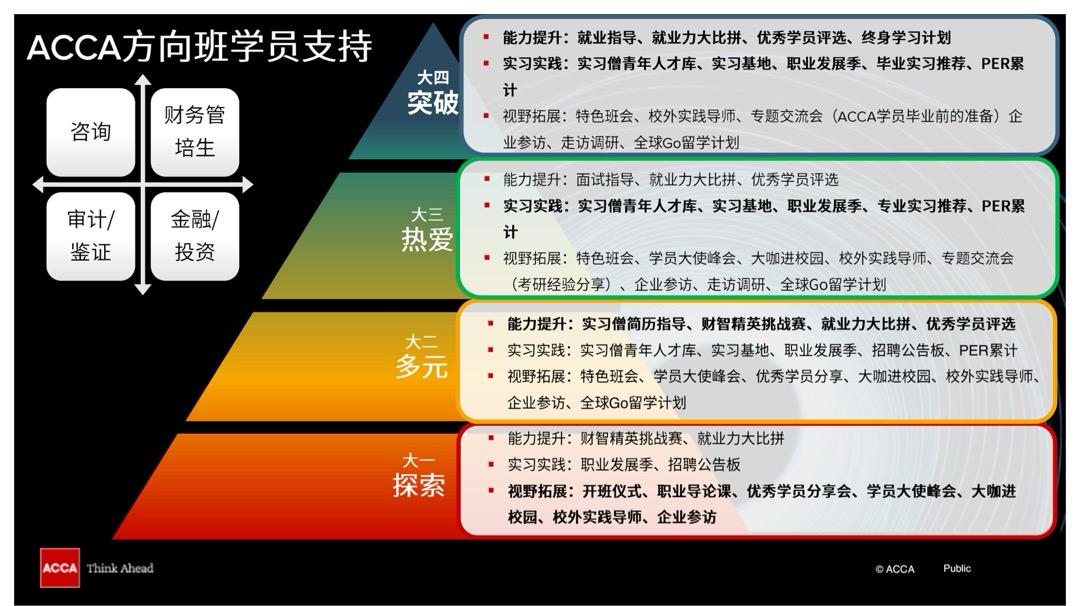 6、广阔的就业前景。本班学生可享受ACCA官方组织的各种学术、实践活动,并获得ACCA向国内外知名企业(ACCA认可雇主)推荐的就业机会。