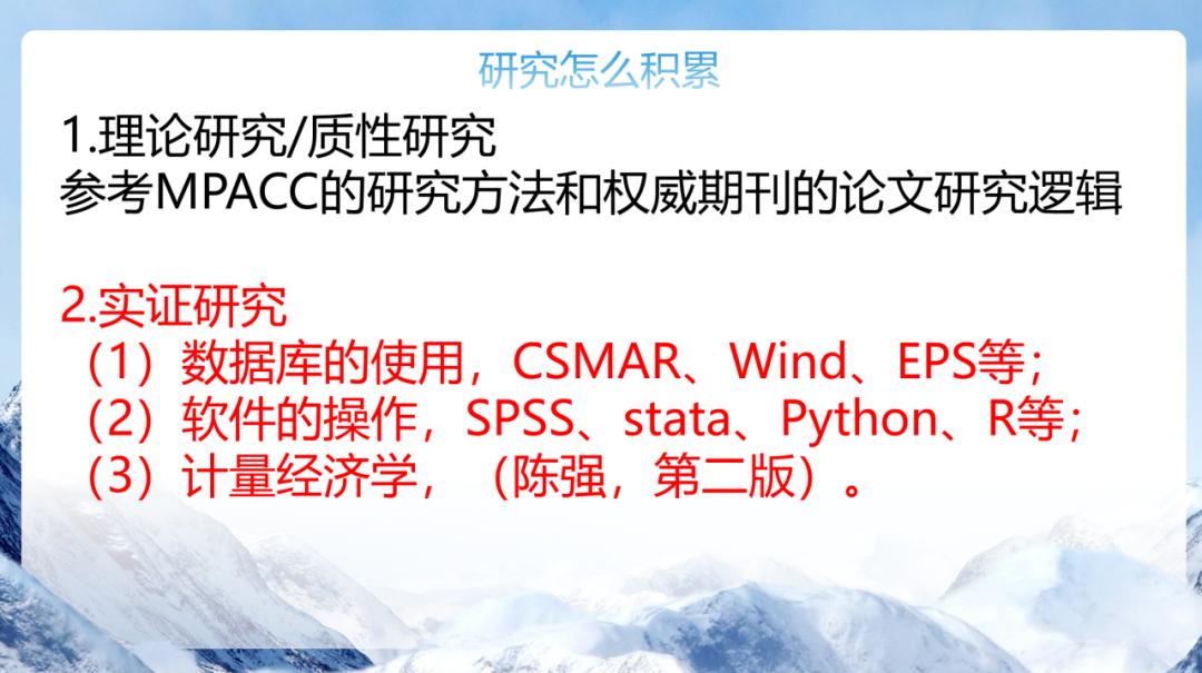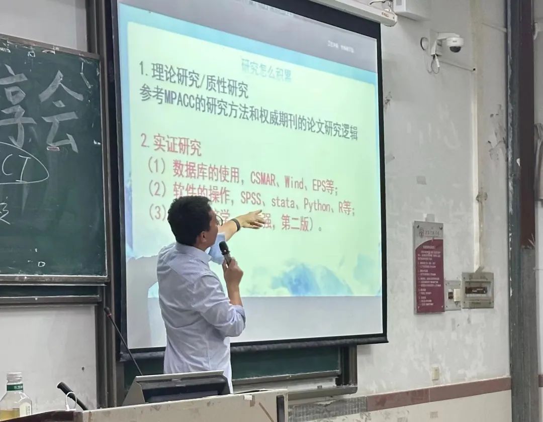 李亚超老师向我们介绍了几种不同的研究方向——案例研究与田野研究,即理性与质性的研究;实证研究,即结合互联网工具为辅进行话题研究。同时,他列举了一些较为热门的研究选题,如数字化转型相关研究、ESG与环境资源会计相关研究、审计相关问题研究等等,使同学们更加有论文撰写的清晰方向。