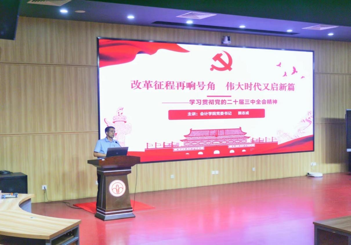 接着,赖志成书记以“改革征程再响号角,伟大时代又启新篇”为主题,概述了党的二十届三中全会及《中共中央关于进一步全面深化改革推进中国式现代化的决定》主要内容,明确了《决定》的三大板块以及六个贯彻的原则。他表示,党的二十届三中全会精神不仅为当前和未来的中国发展指明了方向,还强调了坚持实事求是的重要性,更体现了坚持守正创新的原则,对当前中国改革具有重大意义。赖志成书记还从新时代大学生的视角出发,讲述应该如何全面理解党的二十届三中全会的重大时代意义和深远历史影响。随后,赖志成书记讲述了新时代大学生应该如何全面领悟和把握党的二十届三中全会精神,勉励同学们以更加昂扬的斗志、更加坚定的信心,为推动中国特色社会主义事业不断向前发展贡献力量。