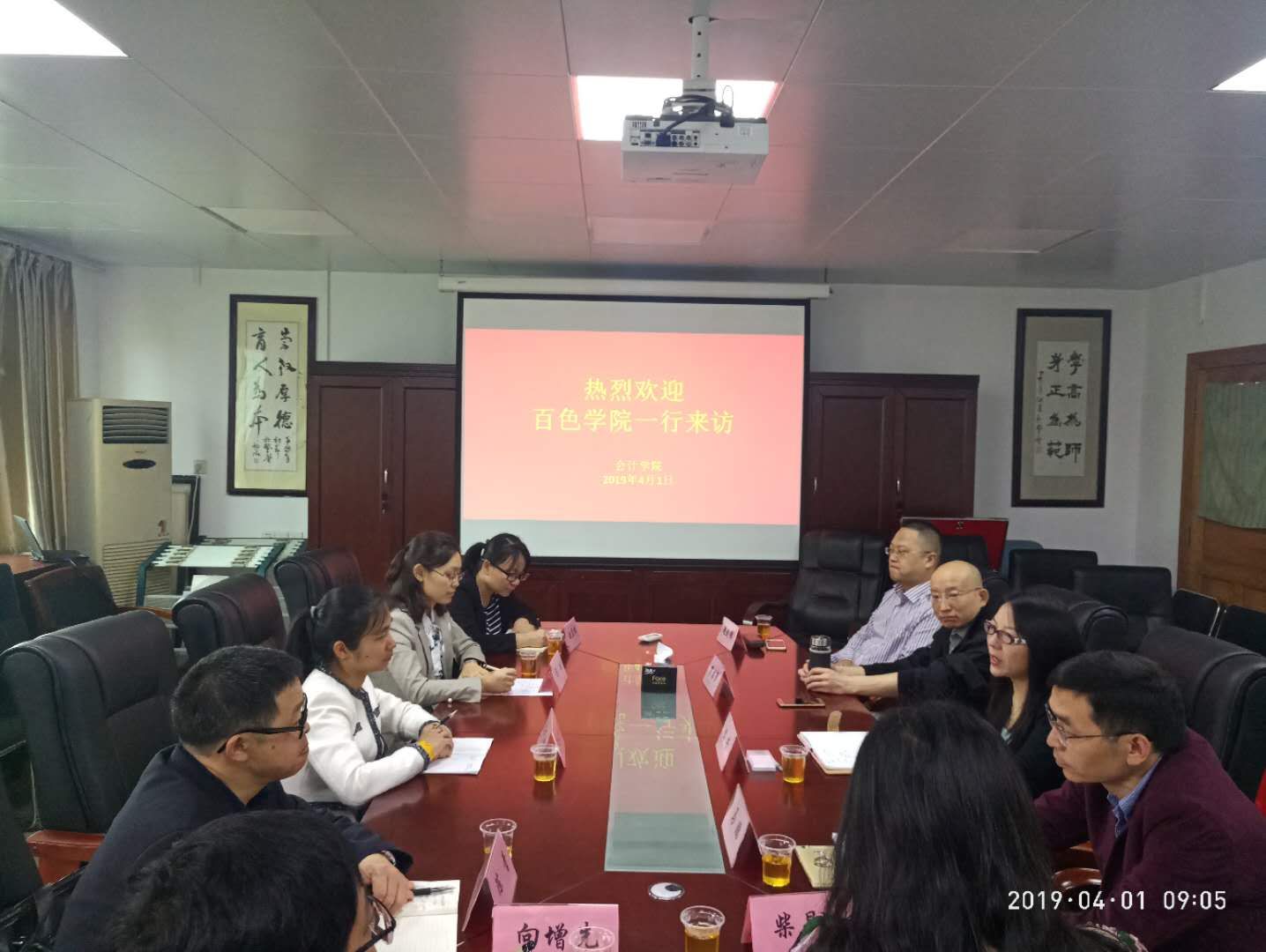 4月1日,百色学院工商管理学院一行6人来访bat365官网,来访人员有百色学院工商管理学院财务管理系系主任冯巧玲、副主任白兰琼及相关老师,bat365官网文芳院长、马鹏副院长、罗书章主任、赵剑锋主任接待了百色学院一行。