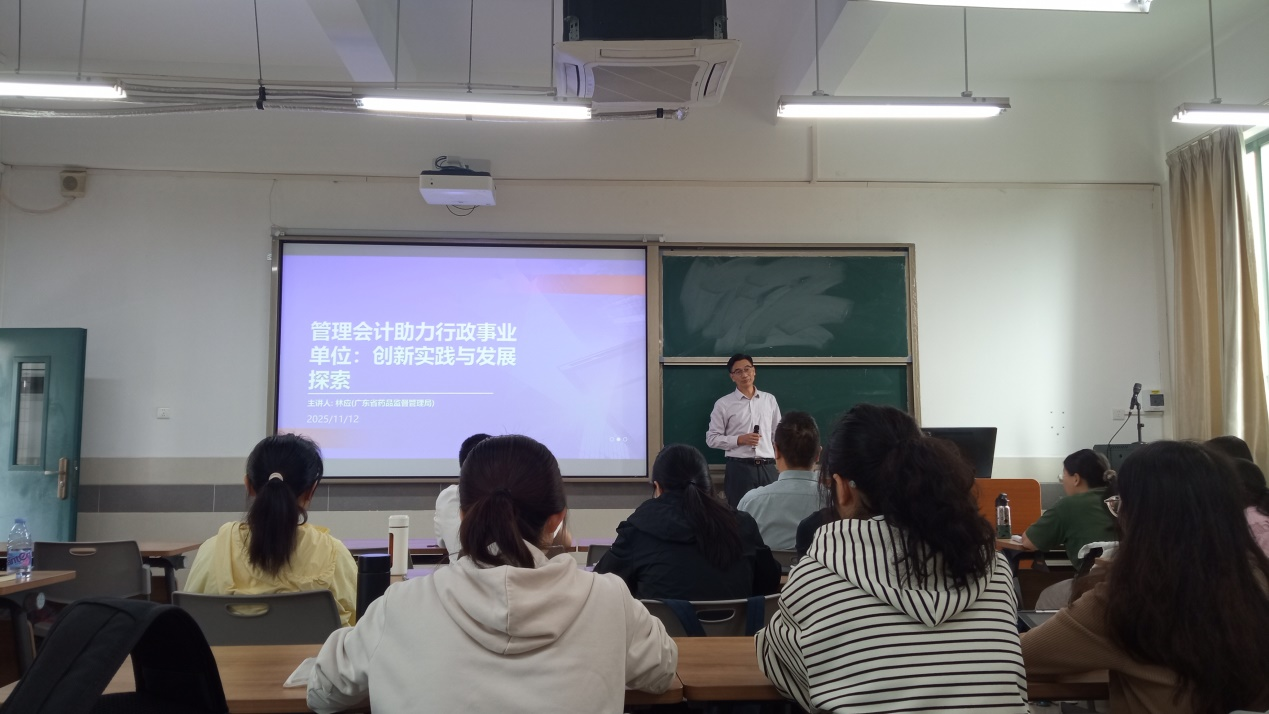 2025年11月12日下午,bat365在线中国官网登录入口在北教B407成功举行行业导师进课堂活动。本次活动邀请了广东省药品监督管理局办公室主任林应导师(原财务处处长、一级调研员)担任主讲嘉宾,走进管理会计理论与实务课堂,讲课主题为“管理会计助力行政事业单位:创新实践与发展探索”。本次行业导师进课堂活动由bat365在线中国官网登录入口赵剑锋副教授主持,2025级会计专硕全体学生参与本次活动。 讲座伊始,林应主任首先对管理会计与行政事业单位的基本概念进行了系统梳理。他结合广东省深化机构改革的背景,详细阐述了行政事业单位的职能分类与运行特点,包括行业专项管理、市场监管体系、公共安全与司法保障、自然资源与生态保护等职能模块,并指出事业单位在提供公共服务方面的重要支撑作用。他强调,管理会计正在从传统的“账房先生”向“战略参谋”转变,其核心价值在于优化资源配置、提升运营效率、强化绩效管理和支撑科学决策。 接着,林主任结合广东省药监局的实际工作,分享了管理会计在行政事业单位中的创新实践。他提出“管理会计循环驱动链”模型,涵盖“规划决策—成本控制—绩效监督”三大环节,并通过六个典型案例生动展示了管理会计在预算编制、内控建设、绩效评价等方面的具体应用。林主任指出,“预算编制是规划实施的关键,项目能否立项并纳入预算,直接决定后续工作的开展”,凸显了管理会计在政府资源配置中的枢纽作用。 在探讨管理会计在行政事业单位中的深化路径时,林主任提出四点建议:深化业财融合、创新人才培养、加快信息技术应用、优化政策环境。他特别鼓励年轻师生积极探索人工智能在管理会计中的实践路径,并系统阐述了AI如何破解传统管理会计在数据孤岛、分析浅层、效率低下等方面的痛点。他从“智能预算管理”“精准成本控制”“科学绩效评价”等场景出发,描绘了“AI+管理会计”在政府治理中的广阔前景。 在课堂互动环节,与会师生围绕“政府采购中的挑战与应对”“职业生涯发展建议”“业财融合实践路径”等问题踊跃提问。林主任结合自己二十三年的机关工作经历,强调“诚实、公正、忠诚”是财务人员的立身之本,鼓励大家在守住底线的基础上勇于担当、创造价值。 最后,林主任以“学以致用、知行合一、精业笃行、守住底线、修身明德、久久为功、胸怀大局、勇于担当”三十二字箴言勉励在场师生。他希望大家锤炼专业本领,恪守职业操守,提升人生格局,强化使命担当,在新时代背景下,立足粤港澳大湾区建设,投身“十五五”规划实践,争做“价值创造者”,为高质量发展贡献会计智慧与力量,谱写时代华章。